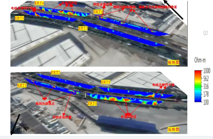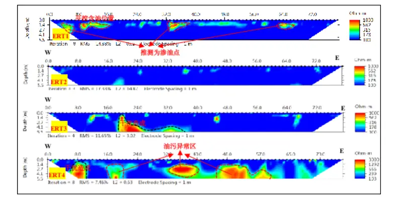 From the resistivity grid diagram and two-dimensional section, the red dotted line can be clearly depicted as the abnormal area .This anomaly is characterized by relatively high impedance region and the abnormal feature is the anomaly in the relatively high resistivity area. In addition, there were 4 anomalies (red dotted line) in ERT1, which were presumed to be oil seepage points. The anomalies at the horizontal position of 8-16 meters were those at the site excavation, which were verified to be oil-bearing areas. The measured results were consistent with the excavation verification results. There are 3 anomalies in ERT4, which are supposed to be abnormal characteristics caused by oil products.ERT2 and ERT3 have no obvious abnormal areas caused by contamination. In summary, it is speculated that the pollution depth of the investigation area is about 1.4 meters below, and the oil leakage mode is through the local circulation channel, and the pollution is mainly distributed on the north side of the road.From the resistivity grid diagram and two-dimensional section, the red dotted line can be clearly depicted as the abnormal area .This anomaly is characterized by relatively high impedance region and the abnormal feature is the anomaly in the relatively high resistivity area. In addition, there were 4 anomalies (red dotted line) in ERT1, which were presumed to be oil seepage points. The anomalies at the horizontal position of 8-16 meters were those at the site excavation, which were verified to be oil-bearing areas. The measured results were consistent with the excavation verification results. There are 3 anomalies in ERT4, which are supposed to be abnormal characteristics caused by oil products.ERT2 and ERT3 have no obvious abnormal areas caused by contamination. In summary, it is speculated that the pollution depth of the investigation area is about 1.4 meters below, and the oil leakage mode is through the local circulation channel, and the pollution is mainly distributed on the north side of the road.